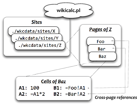 式の入ったセルは他のウェブサイトでホストされる WikiCalc ページの値を参照できる。