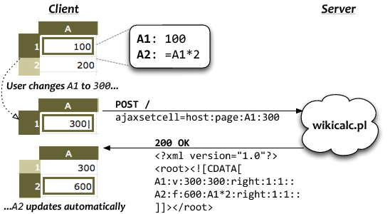 再計算が最新のデータを使うことを保証するために、WikiCalc は全ての状態データをサーバーに保存する薄いクライアント (thin-client) デザインを採用しています。スプレッドシートはブラウザ上で <table> 要素として表されます。セルを編集すると ajaxsetcell の呼び出しがサーバーに送信され、これを受けてサーバーはブラウザにどのセルを更新するかを返します。