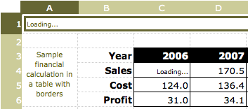 当たり前ではあるのですが、このデザインはブラウザとサーバーの間の高速な接続を仮定しています。レイテンシが高い環境では、ユーザーはセルの値の更新が反映されるまでの間に “Loading...” というメッセージを頻繁に目にすることになります (図 19.4)。入力をいじってインタラクティブに式を編集するような、結果がリアルタイムに見える必要のある使い方をするユーザーにとって、これは特に問題です。