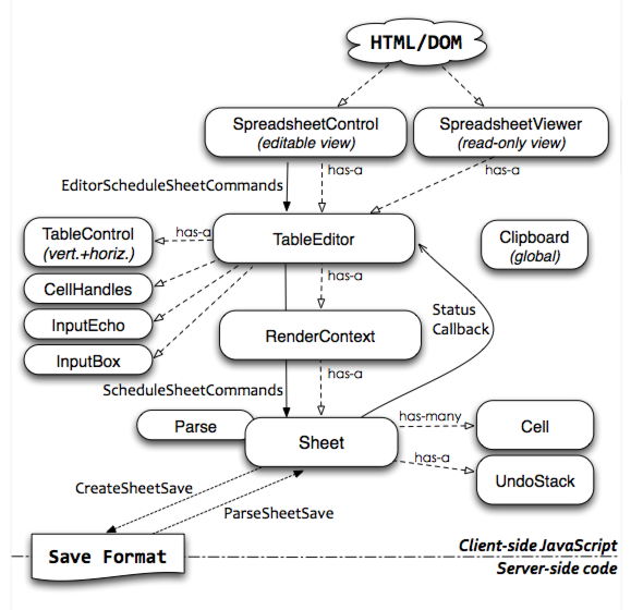 図 19.5 と 図 19.6 に SocialCalc のインターフェースとクラスをそれぞれ示します。WikiCalc と比べると、サーバーの役割は大きく削減されています。サーバーの唯一の役目は HTTP GET を受け取ったときに save フォーマットのスプレッドシートを送り返すことだけです。ブラウザがデータを受け取ると、それからの更新の検出や計算、およびユーザーとの対話は全て JavaScript で実行されます。