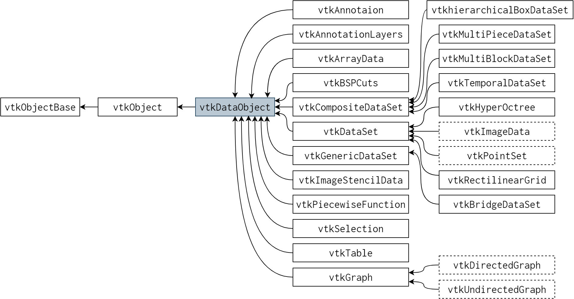 VTK の強みの一つが、複雑な形式のデータを表現する能力です。扱うデータ形式は表のようなシンプルなものから有限要素メッシュのような複雑なものまであります。図 24.1 に示すように、こういったデータ形式は全て vtkDataObject の子クラスです (データオブジェクトクラスが関わる継承図の一部分を取り出しています)。