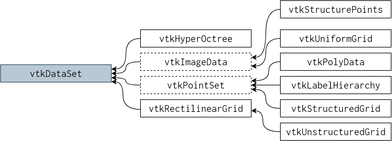 vtkDataObject の一番重要な特徴の一つが、次項で説明する視覚化パイプラインで処理できることです。ここにはたくさんのクラスが示されていますが、実際のアプリケーションで使われるのはほんの少しです。vtkDataSet とその派生クラスは科学的可視化に使われます (図 24.2)。例えば vtkPolyData はポリゴンメッシュを表現するのに使われ、vtkunstructuredGrid はメッシュを、vtkImageData は 2D/3D のピクセル/ボクセルデータを表現します。