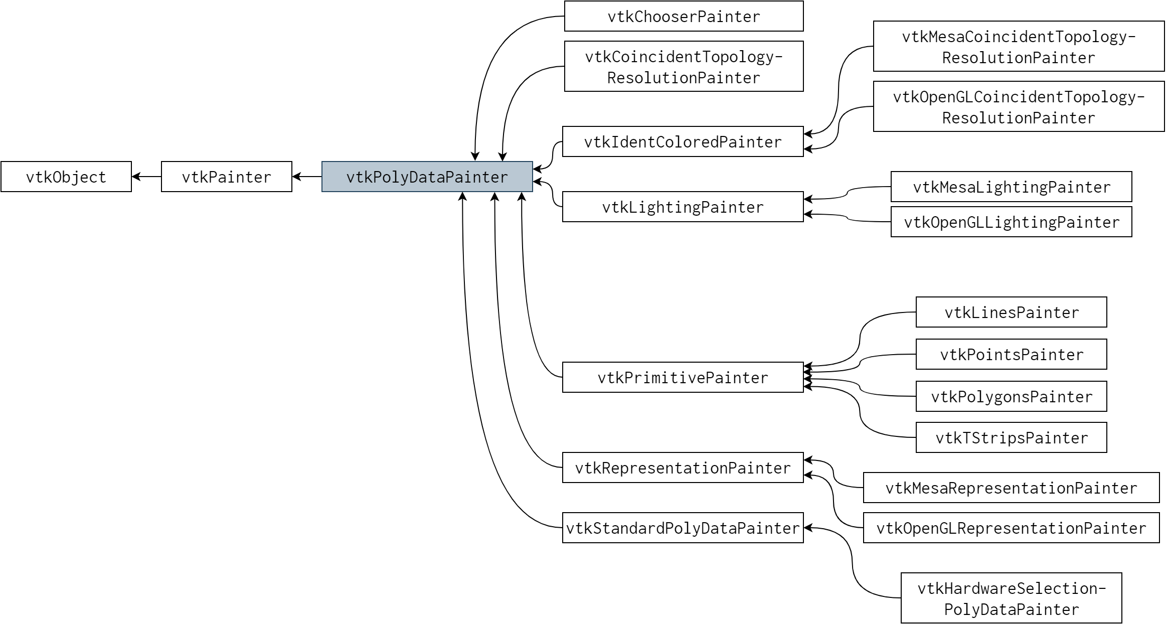 同様に VTK がサポートするデータモデルも成長し、データとレンダリングシステムのインターフェースであるマッパーも種類が増えました。大きく拡張されたもう一つの領域が変形を表す階層構造です。最初は 4×4 の単純な変形行列を使っていましたが、現在では薄板スプライン変形 (thin-plate spline transformation) などの非線形変形をサポートするパワフルな階層構造が使われます。例えば最初の vtkPolyDataMapper は (vtkOpenGLPolyDataMapper といった) デバイス固有の子クラスを持っていましたが、現在では “painter” パイプラインと呼ばれるより洗練されたグラフィックパイプラインに取って代わられました (図 24.4)。