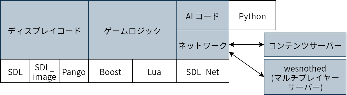 Wesnoth のコアエンジンは C++ で書かれ、執筆時点で 20,000 行ほどです。このコードはエンジンの中心部分であり、コードベースの半分はコンテンツと関係がありません。Wesnoth のゲームコンテンツは Wesnoth Markup Language (WML) と呼ばれるユニークなデータ言語で定義され、25,000 行の WML 言語が含まれます。 WML 言語の割合はプロジェクトと共に変化し、最初は C++ でハードコードされていたゲームコンテンツは WML で定義できるようプログラムが成熟に連れて書き直されました。図 25.1 に Wesnoth のアーキテクチャの概観を示します。灰色の部分は Wesnoth の開発者によって管理され、白い部分は外部の依存プログラムです。