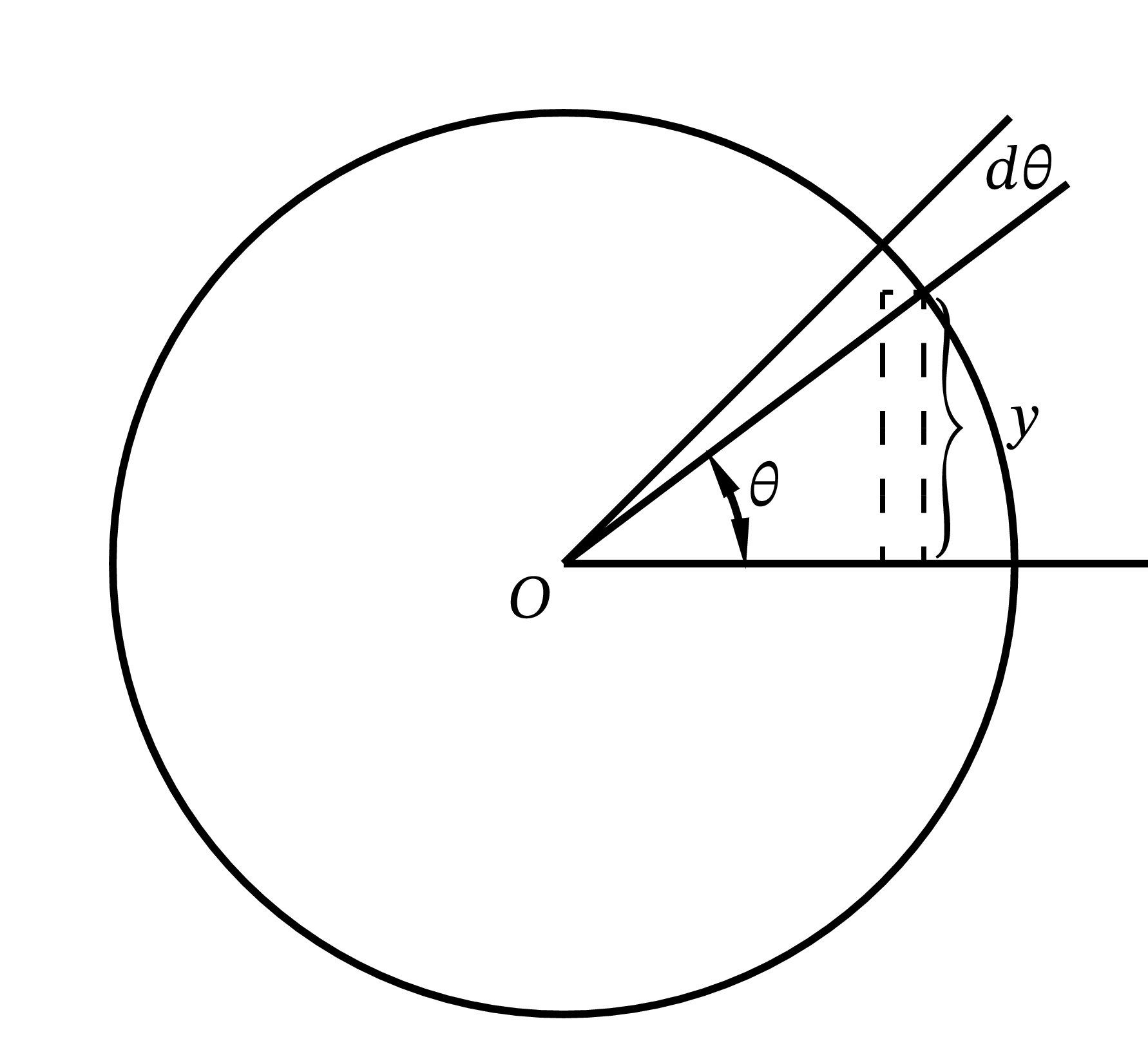 ここで \(d \theta\) を無限に小さくした極限を考えるとき、\(\theta\) と比較したときの \(\dfrac{1}{2} d \theta\) は無視できる。さらに \(\sin\dfrac{1}{2} d \theta\) は \(\dfrac{1}{2} d \theta\) と等しいとみなせる1。すると \[ \begin{aligned} dy &= 2 \cos \theta \times \frac{1}{2} d \theta \\ &= \cos \theta \cdot d \theta \end{aligned} \] となり、最終的な答えが得られる: \[ \dfrac{dy}{d \theta} = \cos \theta \]