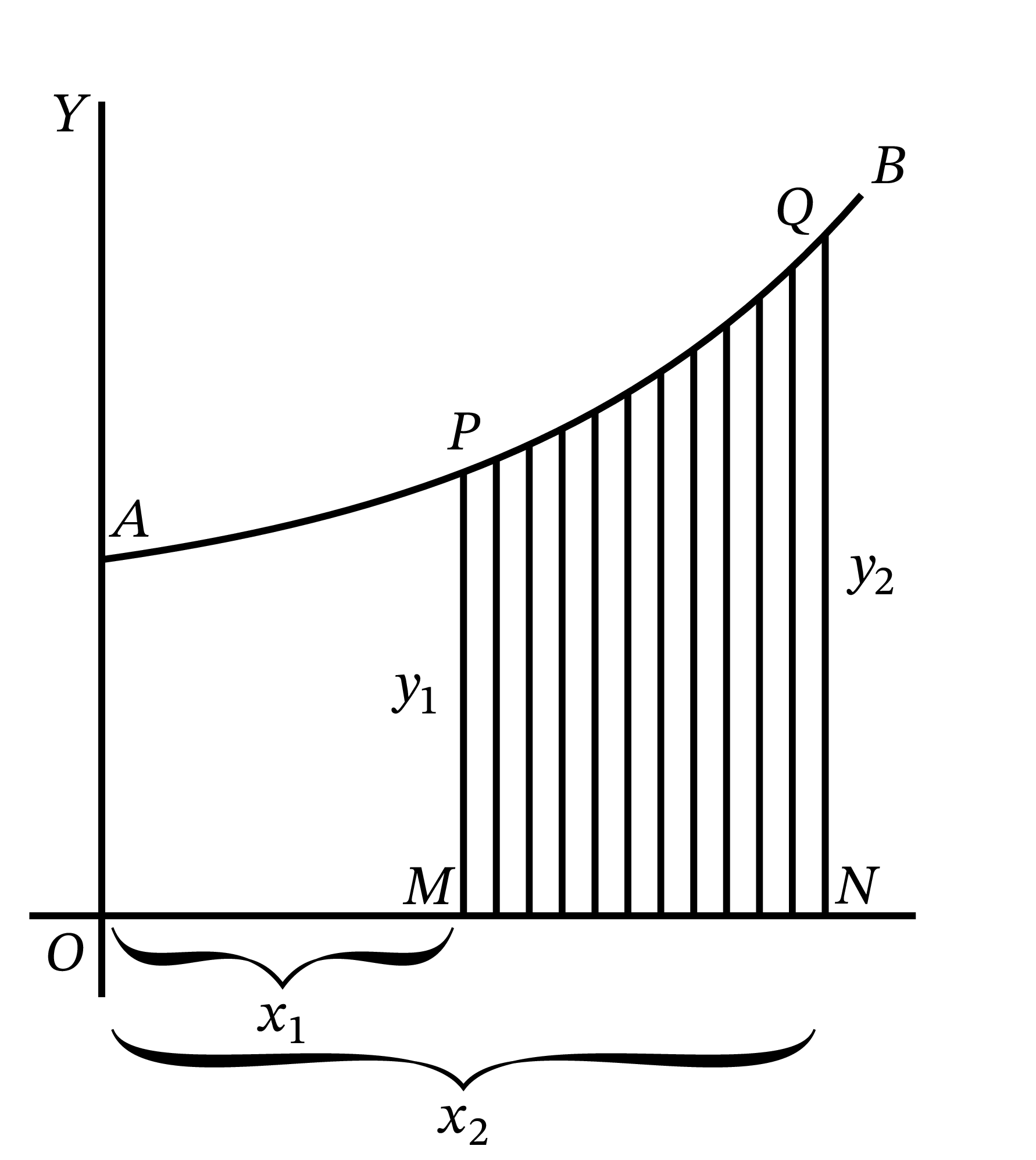 図 52 をもう一度考える。\(x = 0\) に対応する \(A\) から \(x = x_{2}\) に対応する \(Q\) までの広い領域 \(AQNO\) の面積が求まったとする。さらに \(x = 0\) に対応する \(A\) から \(x = x_{1}\) に対応する \(P\) までの領域 \(APMO\) の面積が分かれば、求めるべき領域 \(PQNM\) の面積は二つの面積の差となる。ここから定積分の計算方法が分かる: 定積分は上端で計算した積分と下端で計算した積分の差に等しい。