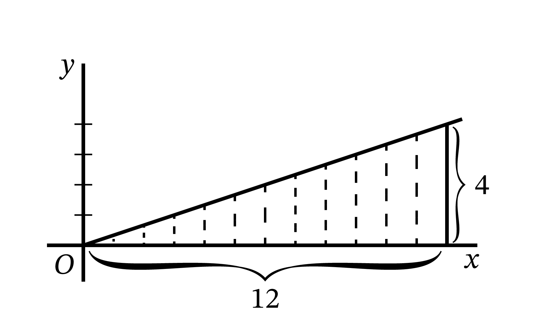 \(\text{(1)}\) 定積分に慣れるために、答が最初から分かっている場合を考えよう。図 53 の三角形は底辺が \(x = 12\) で高さが \(y = 4\) だから、積分を使わなくても面積は \(24\) と分かる。
