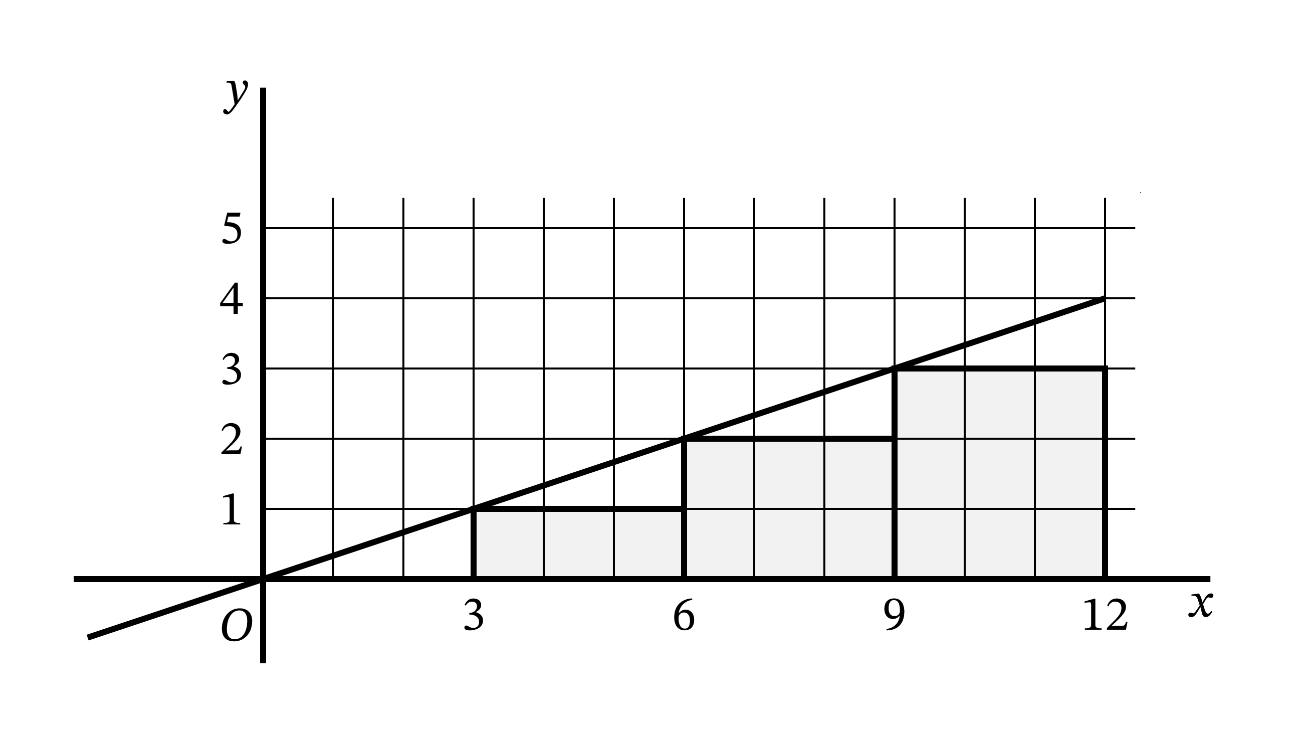 領域の面積を求めるために、\(x = 0\) から \(x = 12\) の間で曲線の下にある正方形の数を数えてみよ。正方形は \(18\) 個あり、その他に正方形 \(\dfrac{3}{2}\) 個分の三角形が四つある。よって全体の面積は \(24\) であり、これは下端 \(x = 0\) から上端 \(x = 12\) までの \(\dfrac{x}{3}\, dx\) の積分と等しい。