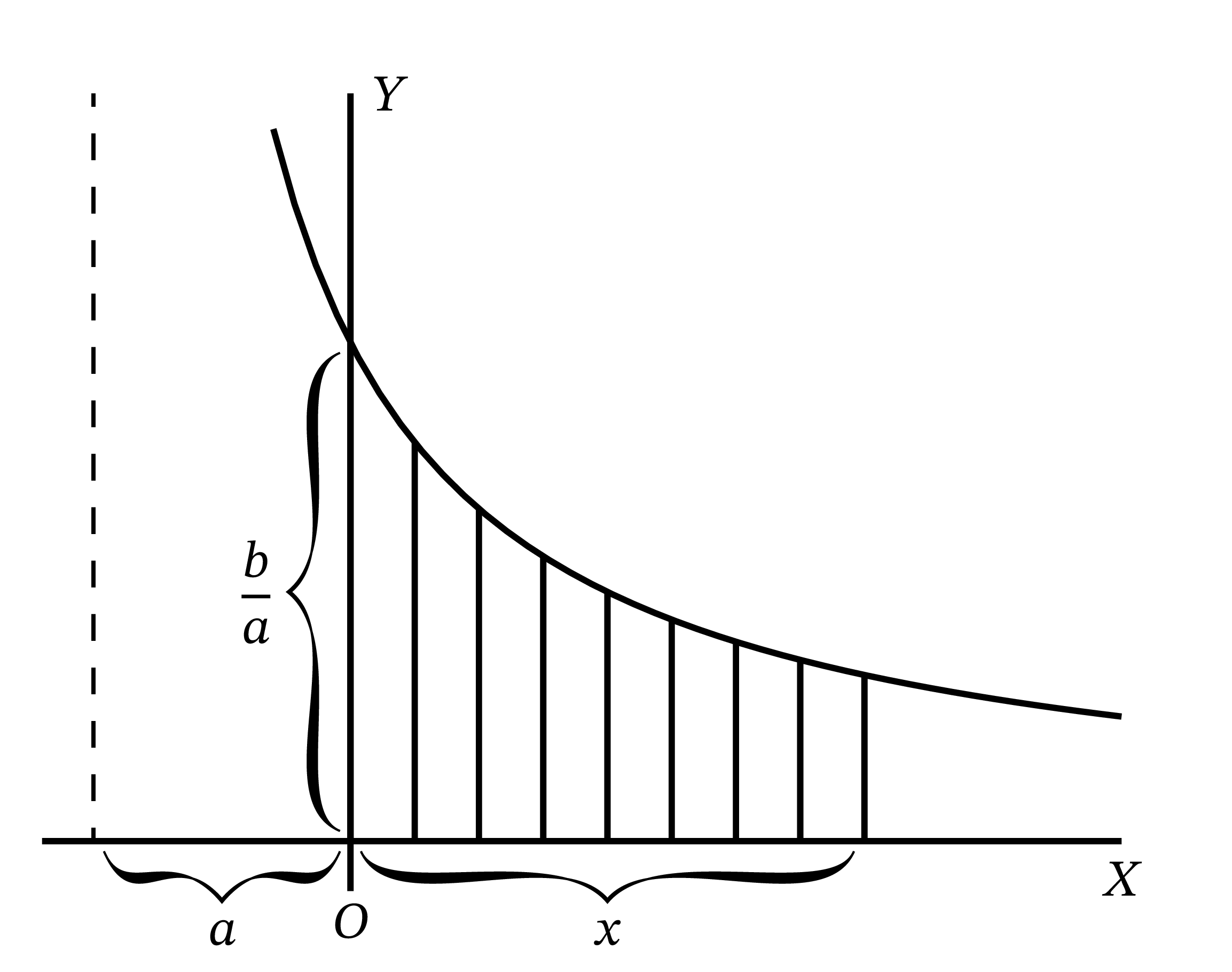 \(\text{(2)}\) 曲線 \(y = \dfrac{b}{x + a}\) の \(x = 0\) から \(x = x_{1}\) の領域 (図 55) の面積を求めよ。 \[ \begin{aligned} {\footnotesize \text{面積}} &= \int^{x=x_1}_{x=0} y \cdot dx \\ &= \int^{x=x_1}_{x=0} \frac{b}{x+a}\, dx \\ &= b \bigl[\log_e(x + a) + C \bigr]^{x_1} _{0}\\ &= b \bigl[\log_e(x_1 + a) - \log_e(0 + a)\bigr] \\ &= b \log_e \frac{x_1 + a}{a} \ \cdots \ \textbf{\small (答)} \end{aligned} \]