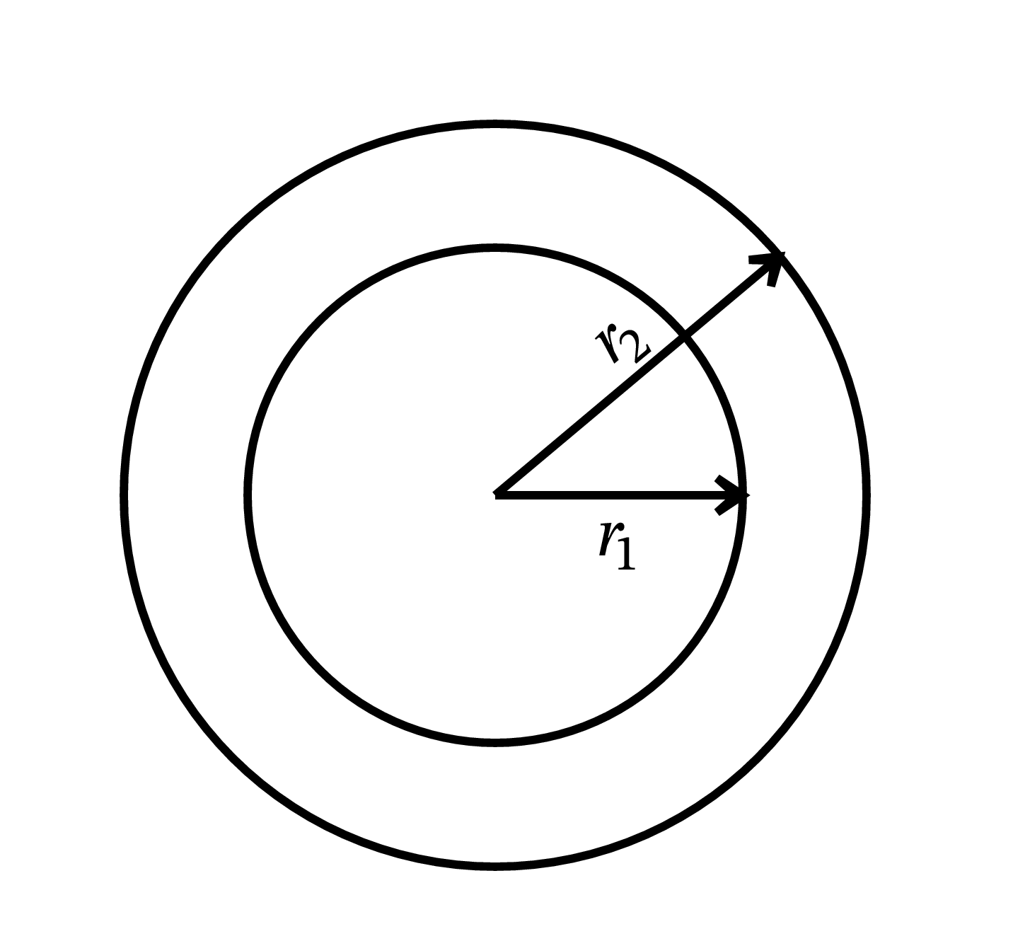 大きな部分から小さな部分を引くという操作は積分以外でも使われることがある。例えば外側の半径が \(r_{2}\) で内側の半径が \(r_{1}\) の環 (図 56) の面積を求める問題を考える。円の面積の公式を使えば外側の円の面積が \(\pi r_{2}^{2}\) で内側の円の面積が \(\pi r_{2}^{2}\) だと分かるので、和の面積この二つの値の差 \(\pi(r_2^{2} - r_1^{2})\) だと計算できる。ちなみにこの式は \[ \pi(r_2 + r_1)(r_2 - r_1) = {\footnotesize \text{和の平均半径}} \times {\footnotesize \text{和の幅}} \] と変形でき、後で回転体ときにはこの式を利用する。