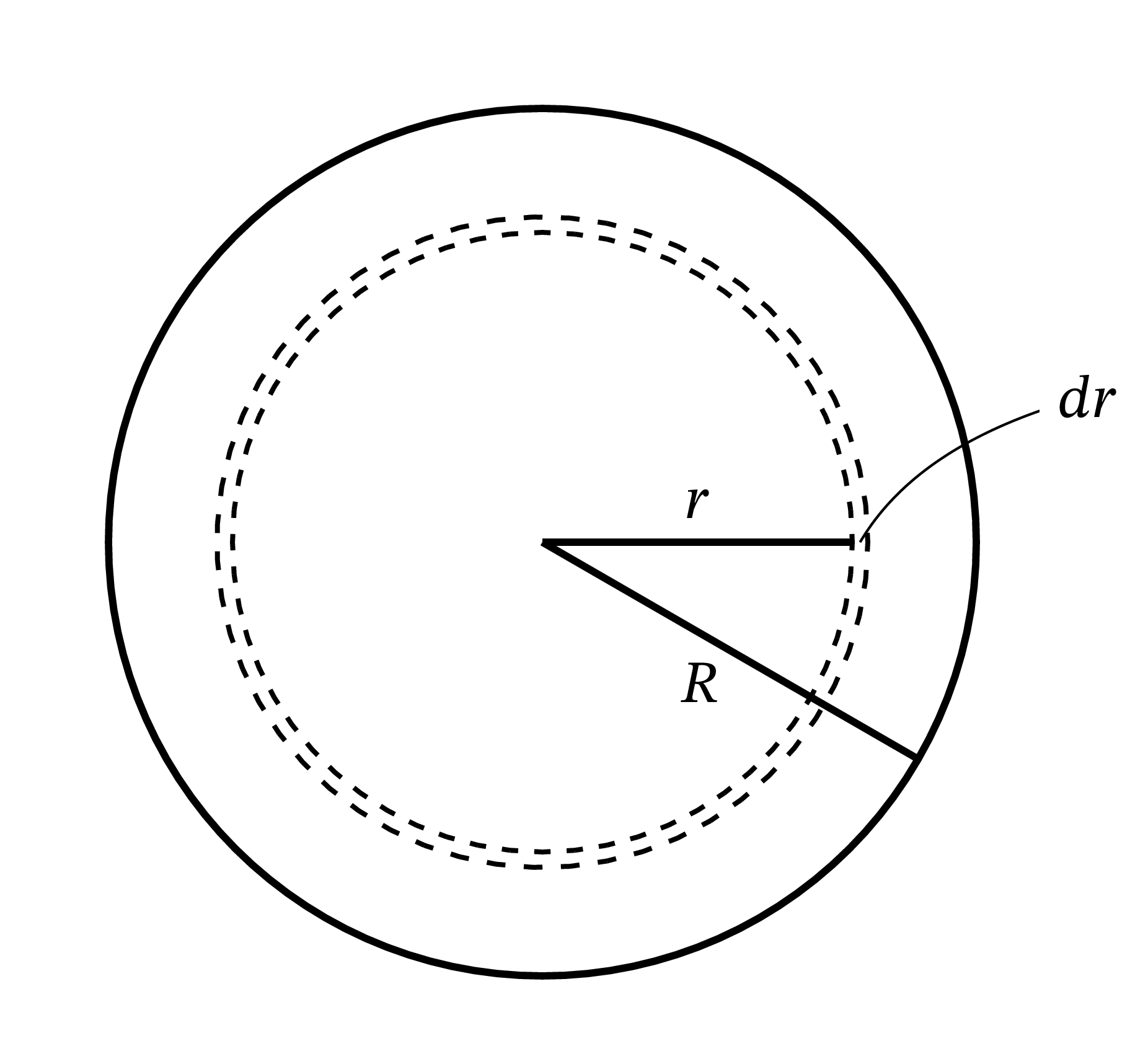 続いて環の面積 \(dA\) を表す式を求める。環を幅 \(dr\) の細い道だと考えれば、その長さは半径 \(r\) の円周と等しい。よってその面積は \[ dA = 2 \pi r\, dr \] となる。ここから円全体の面積が \[ A = \int dA = \int^{r=R}_{r=0} 2 \pi r \cdot dr = 2 \pi \int^{r=R}_{r=0} r \cdot dr \] だと分かる。\(r \cdot dr\) の不定積分は \(\dfrac{1}{2} r^{2}\) より \[ \begin{aligned} A &= 2 \pi \left[\frac{1}{2} r^{2} \right]^{r=R}_{r=0} \\ &= 2 \pi \left[\frac{1}{2} R^{2} - \frac{1}{2}(0)^{2}\right] \\ &= \pi R^{2} \end{aligned} \] を得る。