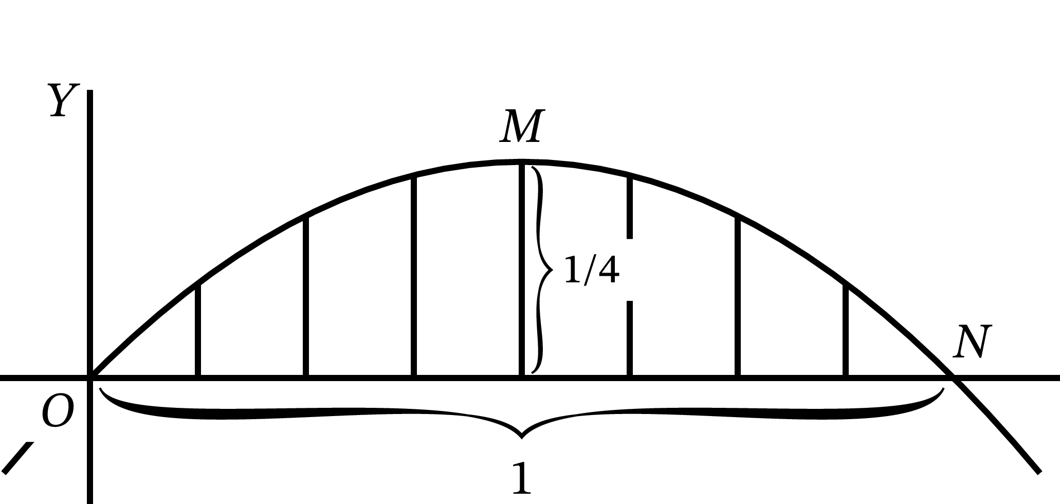 曲線 \(y = x - x^{2}\) の正の部分における \(y\) 座標の平均値を求める問題を考える。この曲線を 図 60 に示す。領域 \(OMN\) の面積を求め、それを底辺 \(ON\) の長さで割ればよい。ただし領域の面積を考える前に、底辺の長さを計算して積分区間を求める必要がある。\(N\) は \(y\) 座標が \(0\) となる点だから、\(y = 0\) となる \(x\) の値を求めればよい。明らかに \(x = 0\) のとき \(y = 0\) だから、考えている曲線は \(O\) を通る。さらに \(x = 1\) のときも \(y = 0\) だから、点 \(N\) の \(x\) 座標は \(1\) だと分かる。