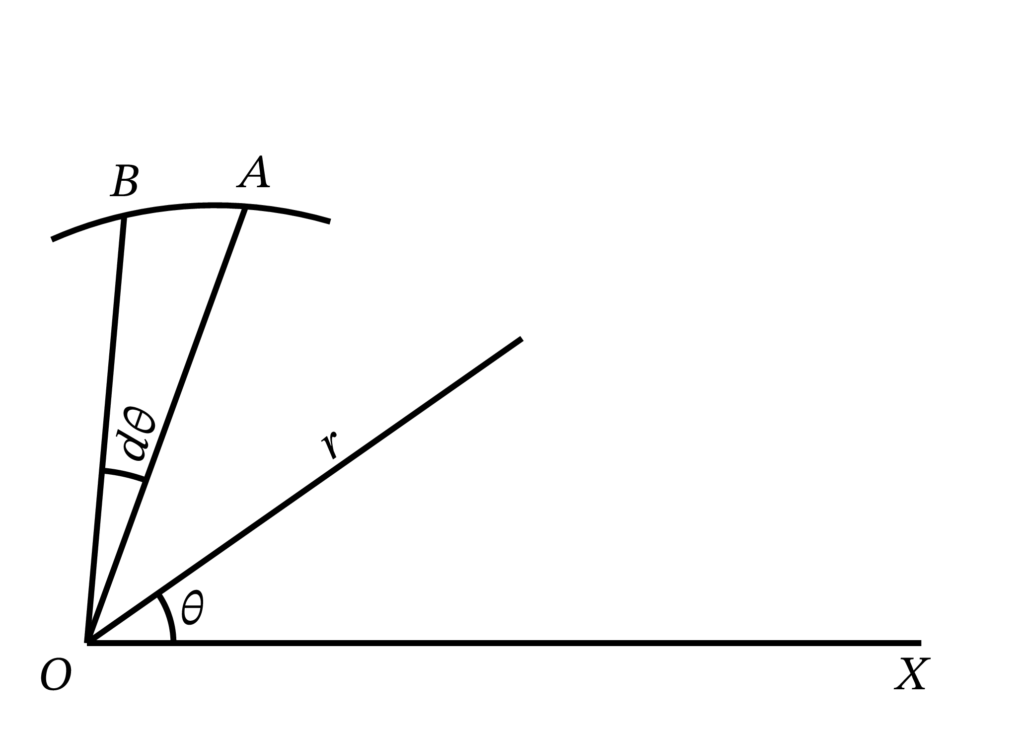領域の境界の方程式が \(r\) と \(\theta\) の関数として表されるとする。ここで \(r\) は極 (pole) と呼ばれる固定点 \(O\) からの距離を表し、\(\theta\) は正の水平方向 \(OX\) との角度を表す (図 61)。これまで説明してきた方法を少し変えれば、この場合にも面積の計算が行える。領域を短冊状に切る代わりに、図中 \(OAB\) で表される小さな三角形に切ることを考える。この三角形は \(O\) の角度が \(d\theta\) であり、\(OA\) と \(OB\) は (\(d \theta\) が小さいとき) ほぼ等しい。三角形全ての面積の和を求めれば、その値が領域の面積となる。