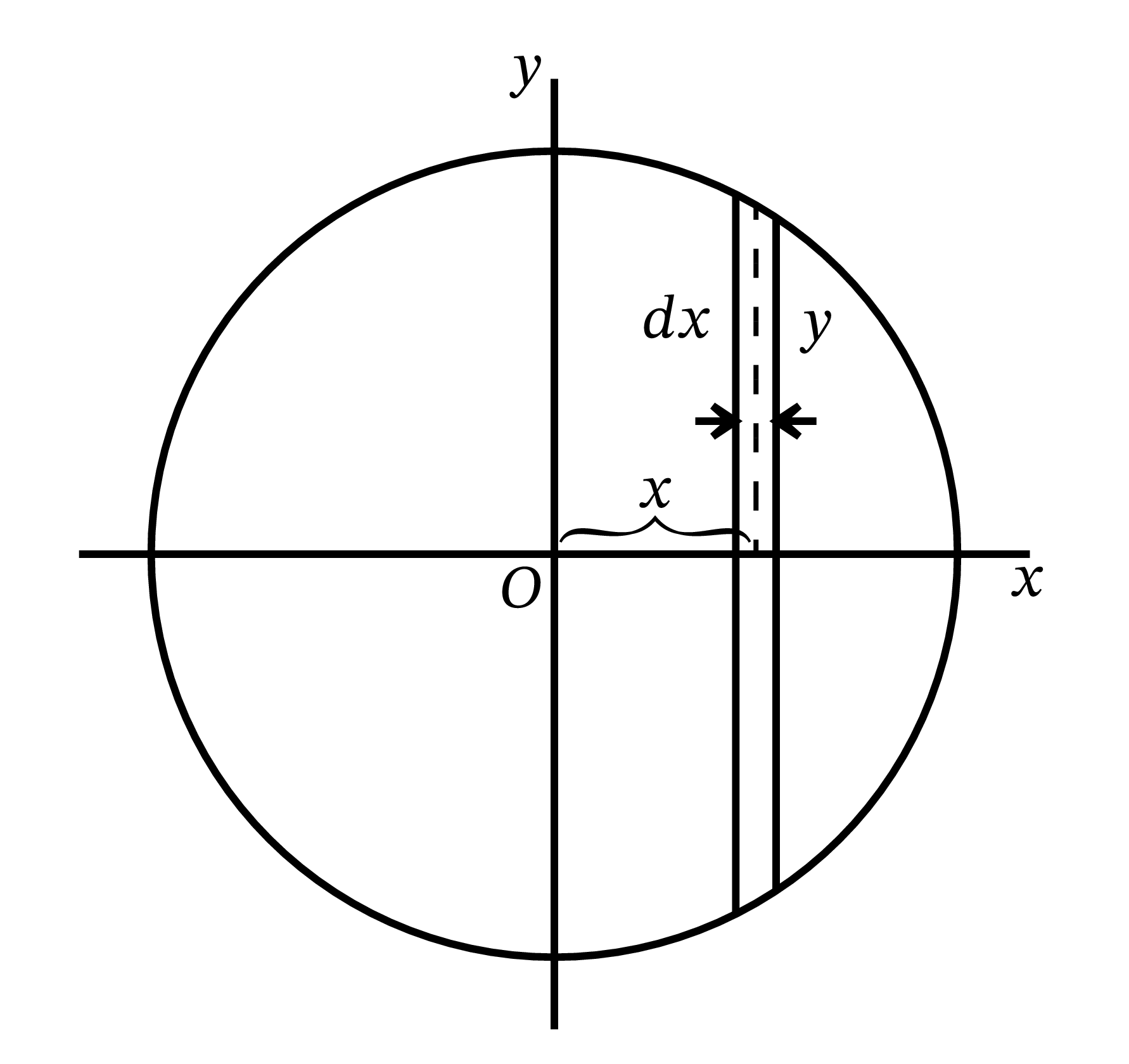 球の体積は次のように求めることもできる。球を 図 62 のように厚さ \(dx\) で \(y\) 軸と平行に切ると、一切れの体積は \(\pi y^{2}\, dx\) となる。\(x\) と \(y\) の間には \[ y^{2} = r^{2} - x^{2} \] という関係があるから、体積は次のように求められる: \[ \begin{aligned} {\footnotesize \text{球の体積}} &= 2 \int^{x=r}_{x=0} \pi(r^{2}-x^{2})\, dx \\ &= 2 \pi \left[ \int^{x=r}_{x=0} r^{2}\, dx - \int^{x=r}_{x=0} x^{2}\, dx \right] \\ &= 2 \pi \left[r^{2}x - \frac{x^{3}}{3} \right]^r_0 = \frac{4\pi}{3} r^{3} \end{aligned} \]