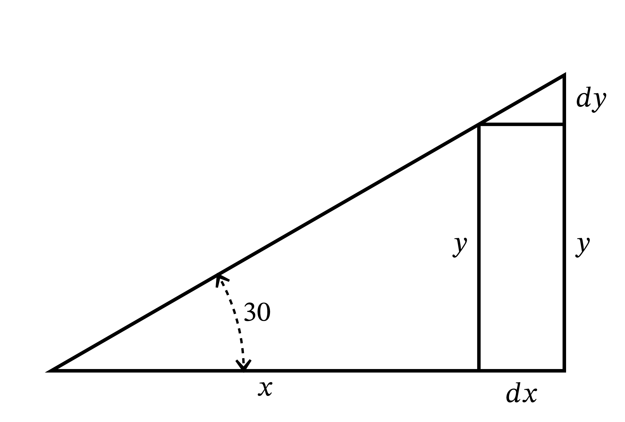 \(\text{(1)}\) 斜辺の傾きが \(30^{\circ}\) で固定された直角三角形を考え、底辺の長さと高さをそれぞれ \(x,\ y\) とする (図 4)。角度を一定に保ったまま三角形を大きくして、底辺の長さが \(x + dx\) に、高さが \(y + dy\) になったとする。つまり \(x\) を増加させた結果 \(y\) が増加したとする。図中の小さな三角形の高さは \(dy\) で底辺の長さは \(dx\) であり、元の三角形と相似である。よって \(\dfrac{dy}{dx}\) は \(\dfrac{y}{x}\) と等しい。斜辺の傾きは \(30^{\circ}\) だから、 \[ \frac{dy}{dx} = \frac{1}{\sqrt{3}} = \frac{1}{1.73} \] が成り立つ。