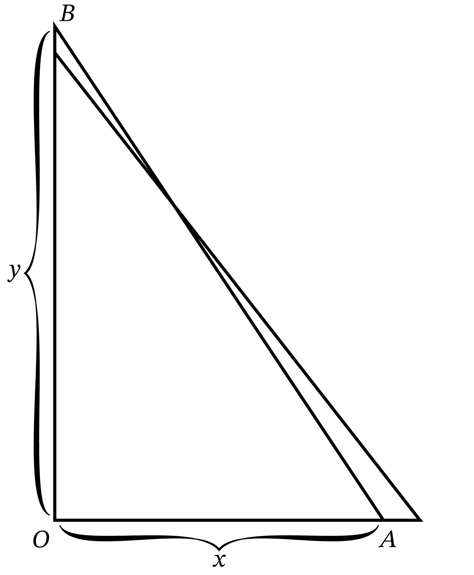 \(\text{(2)}\) 図 5 のように立てかけた梯子を考える。下端から壁までの距離を \(x\) として、梯子の長さは \(AB\) で固定されているとする。さらに \(y\) を梯子の高さとすれば、明らかに \(y\) は \(x\) に依存する。簡単に分かるように、下端 \(A\) を壁から遠ざかる方向に引っ張ると、上端 \(B\) は下に移動する。この様子を科学的な言葉で表してみよう。\(x\) を \(x + dx\) に増加させると、\(y\) は \(y - dy\) となる。つまり \(x\) が正の増加を受けると、その結果生じる \(y\) の増加は負となる。