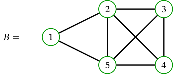 グラフ \(B\) は適切な \(3\)-彩色を持たない。実際、四つの頂点 \(2\), \(3\), \(4\), \(5\) は相互に隣接するので、適切な \(k\)-彩色は \(4\) 個の色を必要とする。よって \(k\geq 4\) でなければならない。