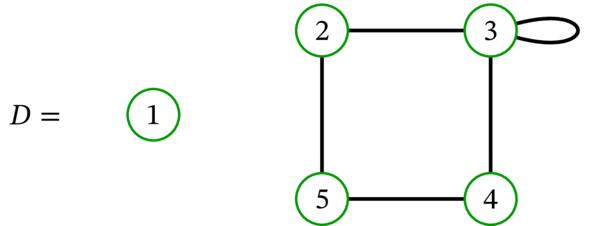 グラフ \(D\) は適切な \(3\)-彩色を持たない。さらに言えば、任意の \(k\in \mathbb{N}\) に対して \(D\) は適切な \(k\)-彩色を持たない。頂点 \(3\) がループを通じて自身と隣接するので、\(G\) の任意の \(k\)-彩色は適切とならない。一般的に言えば、ループを持つグラフは任意の \(k \in \mathbb{N}\) に対して適切な \(k\)-彩色を持たない。