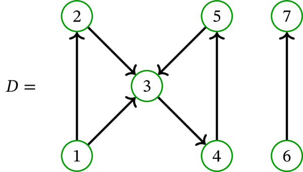 \(D\) の強成分は \(\left\{ 1\right\} \), \(\left\{ 2\right\} \), \(\left\{ 3,4,5\right\} \), \(\left\{ 6\right\} \), \(\left\{ 7\right\} \) である。例えば \(1\not \simeq _{D}2\not \simeq _{D}3\) であるのに対して、\(3\simeq_{D}4\simeq_{D}5\) は成り立つ。