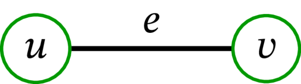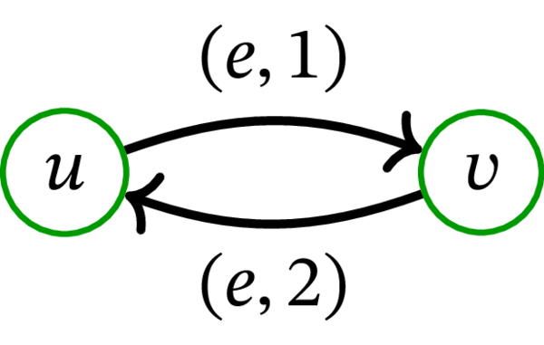 \(G\) の閉路は \(G^{\operatorname*{bidir}}\) の閉路と同じにならない。実際、\(e\) を \(G\) の辺、\(u\), \(v\) を \(e\) の端点とするとき、\(\left( u,e,v,e,u\right) \) は \(G\) の閉路でない。しかし、\(\left( u,\left( e,1\right) ,v,\left( e,2\right) ,u\right) \) または \(\left( u,\left( e,2\right) ,v,\left( e,1\right) ,u\right) \) は \(G^{\operatorname*{bidir}}\) の閉路となる。図を見た方が分かりやすいだろう。\(G\) の辺 \(e\) と頂点 \(u\), \(v\) を次に示す: