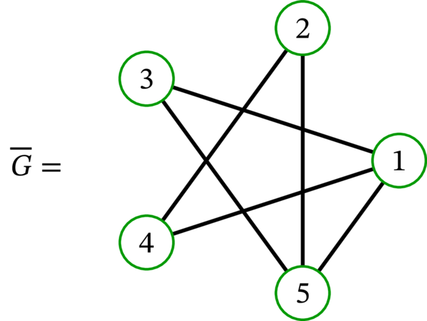 \(\overline{G}\) で任意の二頂点間に辺が存在するのは、同じ二頂点間に \(G\) で辺が存在しないとき、かつそのときに限る。 ↩︎