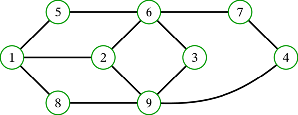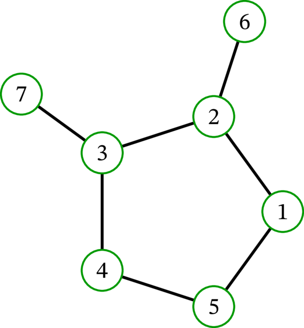 集合 \(\left\{ 12,\ 36,\ 47\right\} \) は \(G\) のマッチングである。このマッチングを \(M\) とすれば、\(M\) でマッチ済みの頂点は \(1\), \(2\), \(3\), \(4\), \(6\), \(7\) であり、これらの頂点の \(M\)-パートナーはそれぞれ \(2\), \(1\), \(6\), \(7\), \(3\), \(4\) である。\(M\) は完全でないものの、例えば \(\left\{ 1,3,4\right\} \)-完全あるいは \(\left\{ 1,2,3,4,6,7\right\} \)-完全ではある。