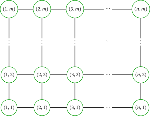 \(n\), \(m\) を正整数とする。\(n\) 次の路グラフ \(P_{n}\) と \(m\) 次の路グラフ \(P_{m}\) のデカルト積 \(P_{n}\times P_{m}\) は \( n \times m \) の格子グラフ (grid graph) と呼ばれ、次の形をしている: