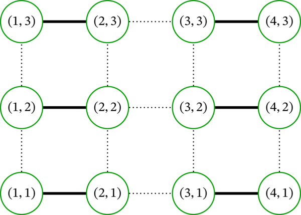 \[ \left\{ \left\{ \left( i,j\right) ,\ \left( i+1,j\right) \right\} \mid i \in \left\{1,3,\ldots,n-1\right\} \ \wedge \ j \in \left\{1,2,\ldots,m\right\} \right\} \]例えば \(n=4\), \(\ m=3\) のとき、この集合を次に示す: