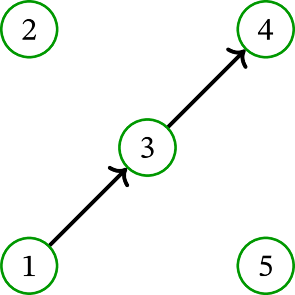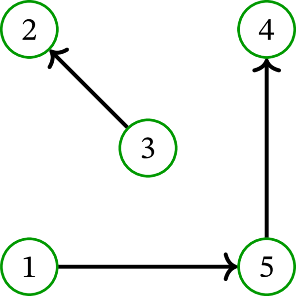 例 10.2.4 の有向グラフを \(D\) とする。定理 10.2.6 によれば、\(D\) の路被覆 \(\mathcal{P}\) と \(D\) の独立集合 \(S\) であって \(\mathcal{P}\) を構成する任意の路が \(S\) の頂点をちょうど一つ含むものが存在する。条件を満たす路被覆と独立集合として \(\mathcal{P}=\left\{ \left( 1,\ast,5,\ast,4\right) ,\ \left( 3,\ast,2\right) \right\} \) と \(S=\left\{ 5,3\right\} \) がある。