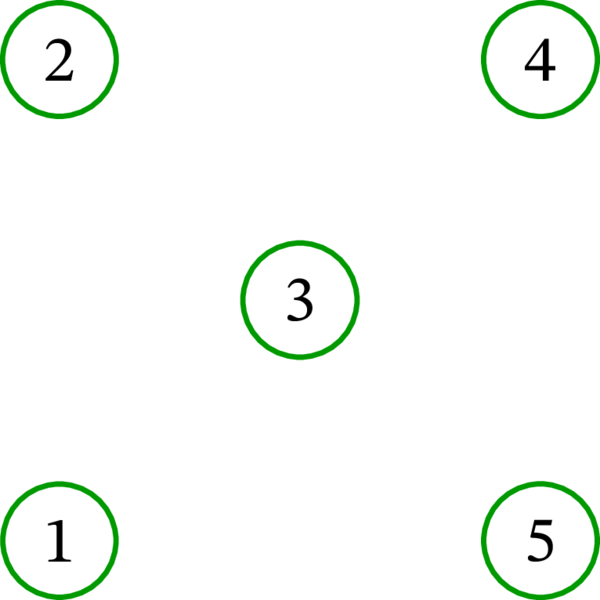 このとき \(\left\{ \left( 1,\ast,5,\ast,4\right) ,\ \left( 3,\ast,2\right) \right\} \) は \(D\) の路被覆である (路に含まれる弧は両端の頂点から一意に定まる上に重要でないので、以前と同様にアスタリスクを使って省略している)。また、\(\left\{ \left( 1,\ast,3,\ast ,4\right) ,\ \left( 2\right) ,\ \left( 5\right) \right\} \) や \(\left\{ \left( 1\right) ,\ \left( 2\right) ,\ \left( 3\right) ,\ \left( 4\right) ,\ \left( 5\right) \right\} \) も \(D\) の路被覆である。これら以外にも \(D\) の路被覆は多くある。