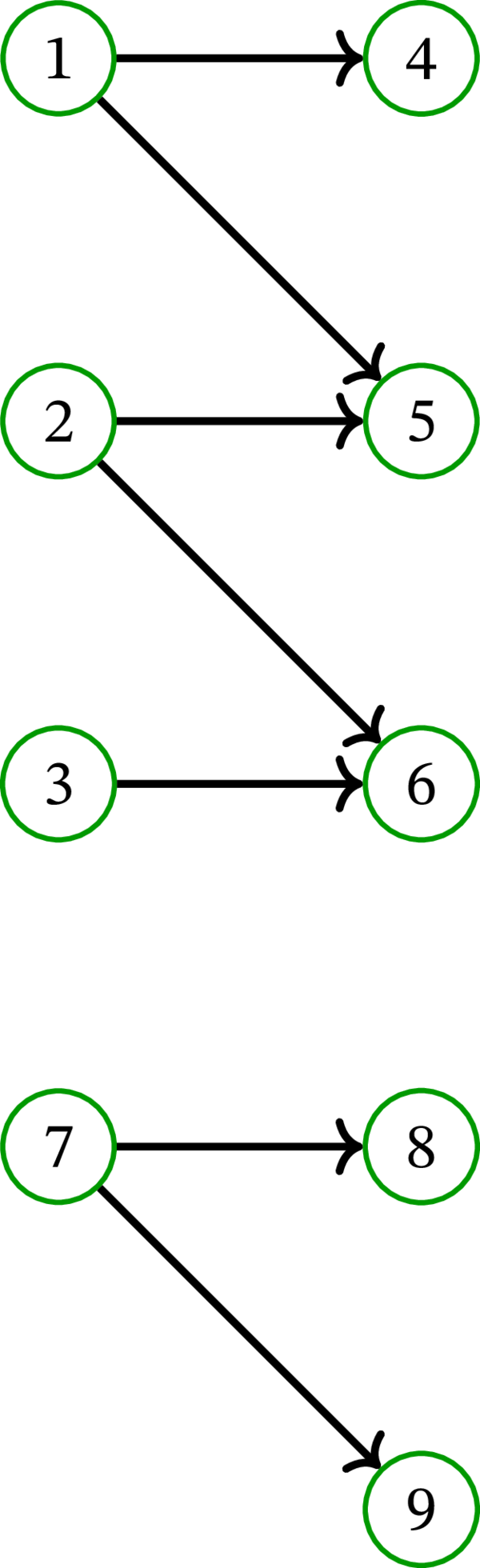 \(G\) の各辺を \(X\) から \(Y\) に向き付けることで得られる有向グラフを \(D\) とする (つまり、\(x \in X\) と \(y \in Y\) を端点に持つ \(G\) の辺に対応して \(D\) には始点 \(x\) と終点 \(y\) を持つ弧が存在する)。このとき弧の始点であり弧の終点でもあるような \(D\) の頂点は存在しない。よって \(D\) の任意の路は長さが \(1\) 以下だと分かる。二部グラフ \(\left( G,X,Y\right) \) と、それに対応する有向グラフ \(D\) の例を次に示す。例 8.2.2 で説明した方法で描画されている: