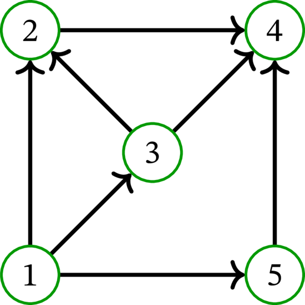 例 10.2.4 の有向グラフを \(D\) とする。定理 10.2.6 によれば、\(D\) の路被覆 \(\mathcal{P}\) と \(D\) の独立集合 \(S\) であって \(\mathcal{P}\) を構成する任意の路が \(S\) の頂点をちょうど一つ含むものが存在する。条件を満たす路被覆と独立集合として \(\mathcal{P}=\left\{ \left( 1,\ast,5,\ast,4\right) ,\ \left( 3,\ast,2\right) \right\} \) と \(S=\left\{ 5,3\right\} \) がある。