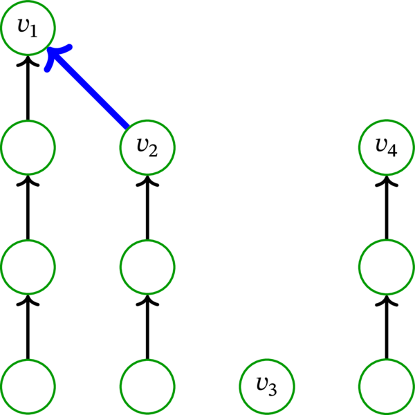 青い弧と頂点 \(v_{1}\) を \(\mathbf{p}_{2}\) の末尾に追加すると、\(\mathbf{p}_{2}\) より長い路が得られる。この路を \(\mathbf{p}_{2}+v_{1}\) と表記する。\(\mathbf{p}_{2}+v_{1}\) の終点は \(v_{1}\) である。