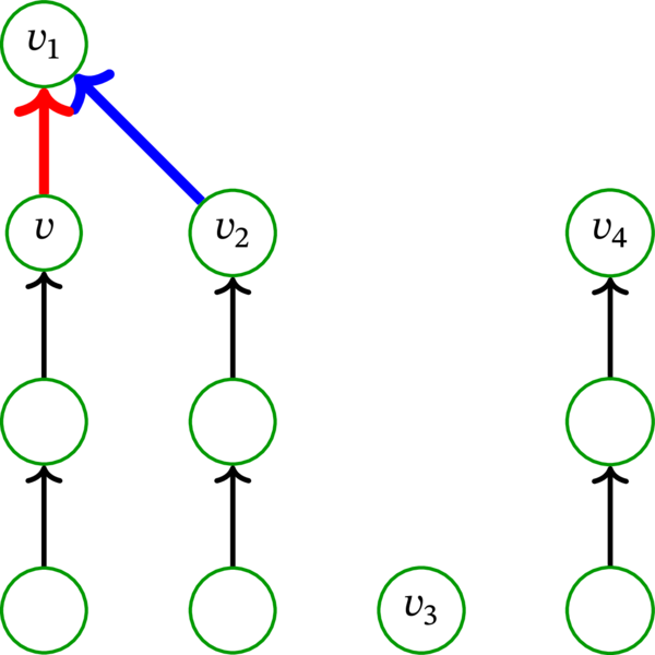 そこで、\(\mathbf{p}_{1}\) の最後から二番目の (\(v_{1}\) の直前の) 頂点を \(v\) とする。このとき路 \(\mathbf{p}_{1}\) は始点 \(v\) と終点 \(v_{1}\) を持つ弧を含む。この弧を赤い弧 (red arc) と呼ぶ。赤い弧の例を次に示す: