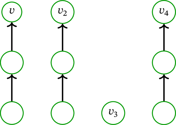 有向グラフ \(D\setminus v_{1}\) (始点または終点に \(v_{1}\) を持つ弧と頂点 \(v_{1}\) を \(D\) から除去して得られるグラフ) を \(D^{\prime}\) とする。\(\mathbf{p}_{1}\) から頂点 \(v_{1}\) と赤い弧を除去して得られる路を \(\mathbf{p}_{1}^{\prime}\) とする。このとき \(\mathcal{P}^{\prime}\colonequals \left\{ \mathbf{p}_{1}^{\prime},\mathbf{p}_{2},\mathbf{p}_{3},\ldots,\mathbf{p}_{k}\right\} \) は \(D^{\prime}\) の路被覆である。ここで \(\mathbf{p}_{1}^{\prime}\) の終点は \(v\) (\(\mathbf{p}_{1}\) の最後から二番目の頂点) であり、\(\mathbf{p}_{2},\mathbf{p}_{3},\ldots ,\mathbf{p}_{k}\) の終点は \(v_{2},v_{3},\ldots,v_{k}\) である。ここから \(\operatorname*{Ends} \mathcal{P}^{\prime} =\left\{ v,v_{2},v_{3},\ldots,v_{k}\right\} \) を得る。有向グラフ \(D^{\prime}=D\setminus v_{1}\) の路被覆 \(\mathcal{P}^{\prime}\) の例を次に示す: