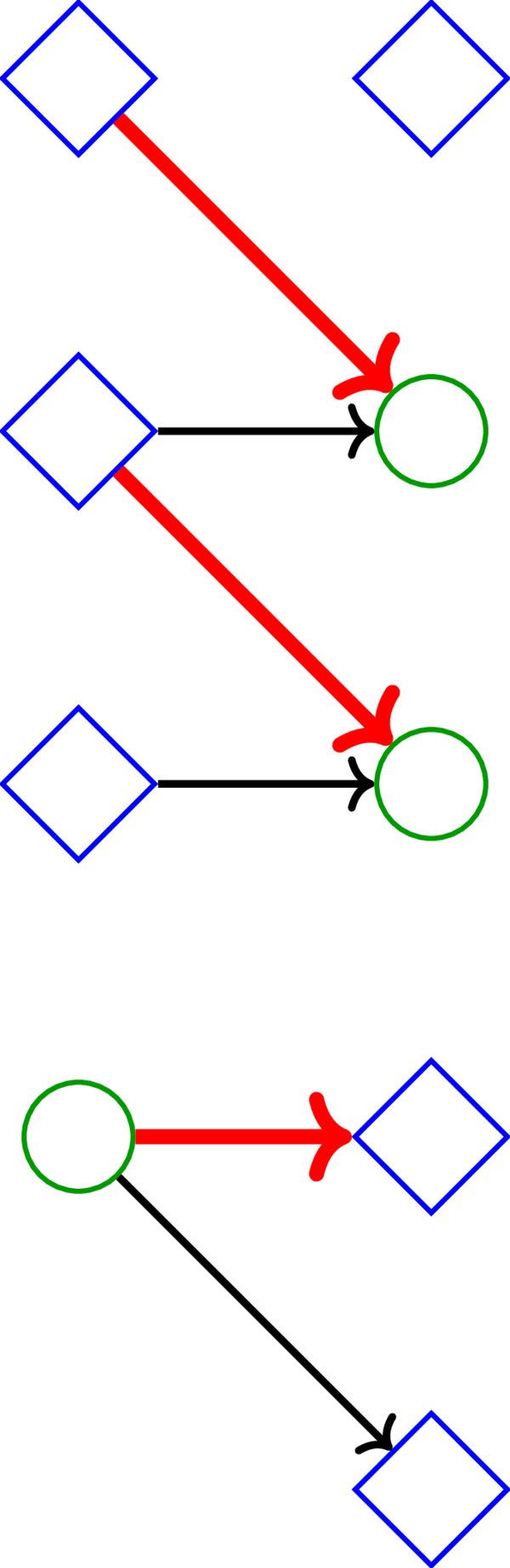 上述の三つの路被覆を図にすると次のようになる。ここでは路被覆に含まれる弧だけを示し、\(D\) の他の弧は無視している: