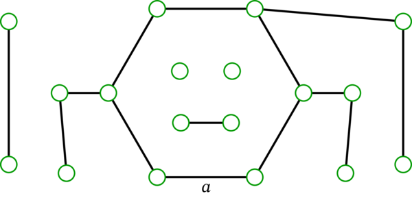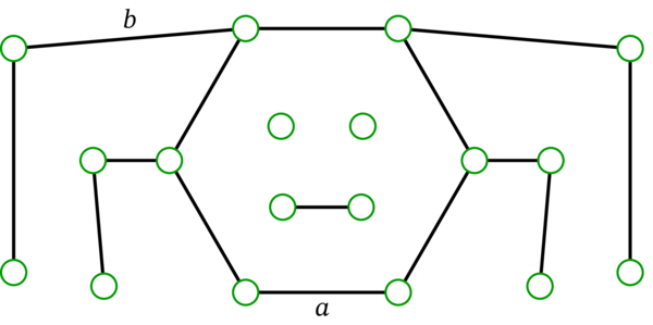 このグラフは \(4\) 個の成分を持つ。辺 \(a\) を含む \(G\) の閉路は存在し、辺 \(b\) を含む閉路は存在しない。定理 2.12.2 (a) で \(e =a\) とすれば、\(G \setminus a\) の成分は \(G\) の成分と一致することが分かる。\(G \setminus a\) の描画を次に示す: