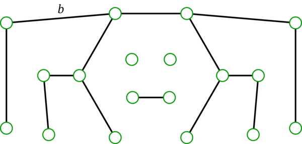このグラフが \(4\) 個の成分を持つことは視覚的に分かる。一方、定理 2.12.2 (b) で \(e = b\) とすれば、\(G \setminus b\) は \(G\) より一つ多い成分を持つことが分かる。\(G \setminus b\) の描画を次に示す: