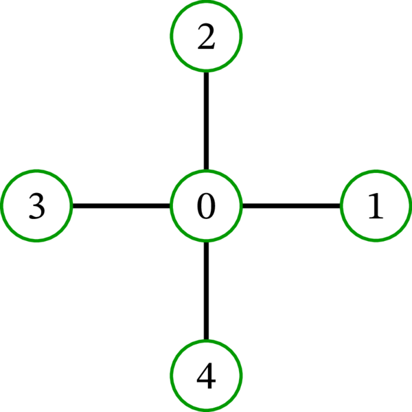 切断頂点も定義できる: 単純グラフ \(G\) の頂点 \(v\) は、\(G\setminus v\) (\(G\) から頂点 \(v\) を除去3したグラフ) が \(G\) より多い成分を持つとき、切断頂点 (cut-vertex) と呼ばれる。ただし残念ながら、系 2.12.5 の切断頂点バージョンと呼べる命題は存在しない。また、頂点の除去による成分の増加は (辺の除去と異なり) \(1\) より大きくなる場合がある (さらに、除去する頂点の次数が \(0\) の場合は成分の個数が減る)。例えば、次のグラフから頂点 \(0\) を除去したグラフを考えてみてほしい: