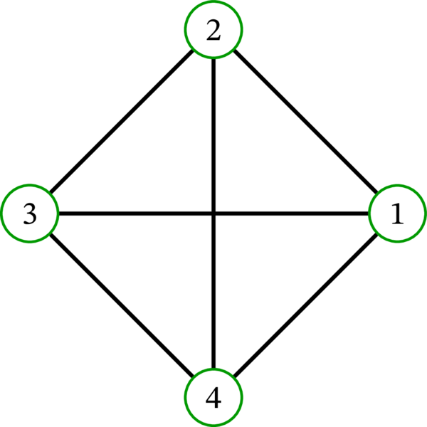ある \(n\in\mathbb{N}\) で \(V=\left\{ 1,2,\ldots,n\right\} \) が成り立つとき、この \(V\) 上の完全グラフを \(K_{n}\) と表記する。