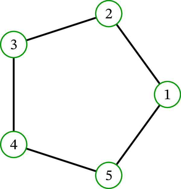 Petersen グラフの頂点は \(\left\{ 1,2,\ldots,5\right\}\) の二要素部分集合であり、二頂点は共通要素を持たないとき、かつそのときに限って隣接する。