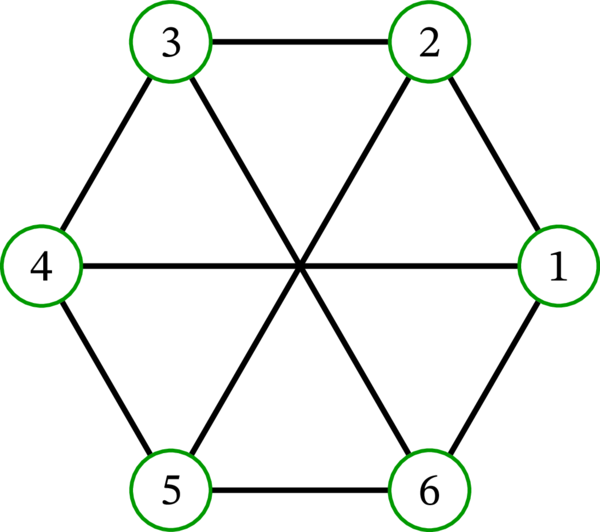このグラフは三角形を持たない。 よって Mantel の定理の対偶から、\(n=6\) および \(e=9\) のとき \(e\leq n^{2}/4\) が成り立つと分かる。実際 \(9=6^{2}/4\) なのでこれは正しい。一方、ここからは \(G\) に一本でも辺を加えると三角形が必ず生じることが分かる。