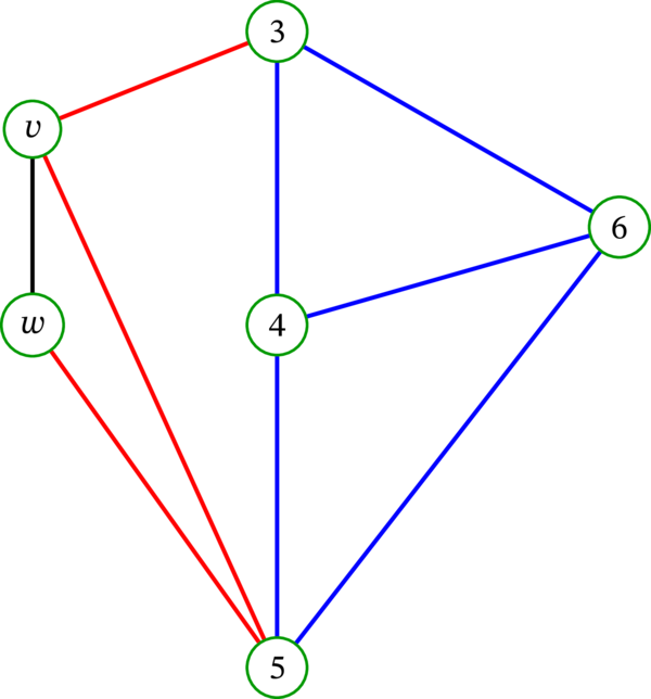 赤い辺はいくつあるだろうか? 最大でも \(n-2\) 個である。実際、赤い辺は \(v\) と \(w\) 以外の頂点一つごとに最大でも一つしか存在できない: もし二つの赤い辺に含まれる頂点が存在するなら、その頂点と \(v\) と \(w\) が三角形となってしまう。