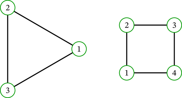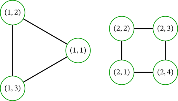注意: \(G\) と \(H\) を単純グラフとするとき、\(G\sqcup H\) と \(H\sqcup G\) は同型であるものの (\(G = H\) の場合を除けば) 同じではない。例えば、\(C_{3}\sqcup C_{4}\) は頂点 \(\left( 2,4\right) \) を持つのに対して、\(C_{4}\sqcup C_{3}\) は持たない。