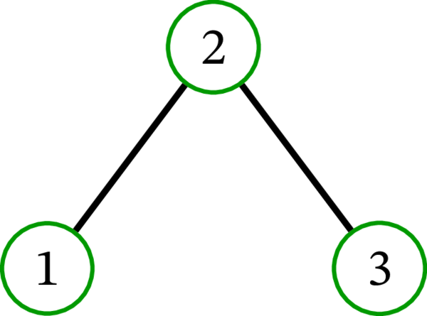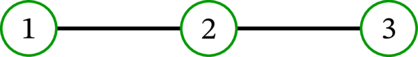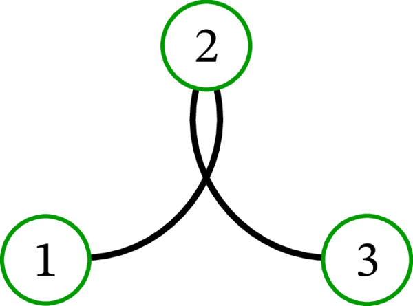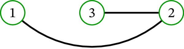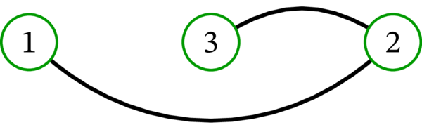 単純グラフ \(\left( \left\{ 1,2,3\right\} ,\ \left\{ 12,23\right\} \right) \) (\(\left\{ u,v\right\} \) を \(uv\) と省略する記法をここでも使っている) は次のように描画できる: