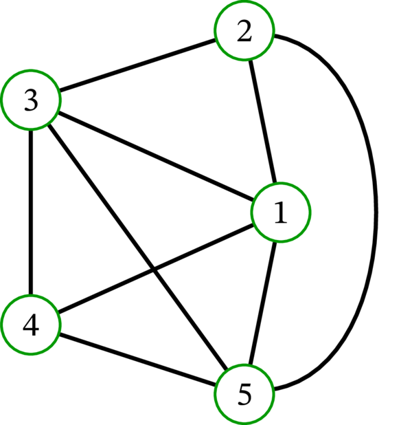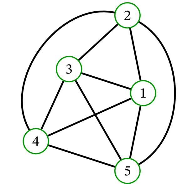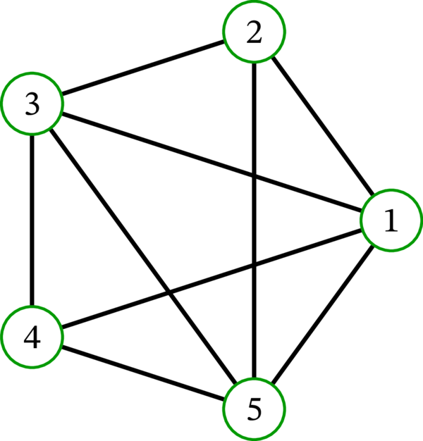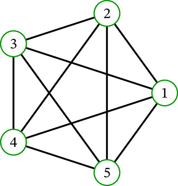 さらにもう一つ、単純グラフ \(\left( \left\{ 1,2,3,4,5\right\} ,\ \mathcal{P}_{2}\left( {\left\{ 1,2,3,4,5\right\} }\right) \right) \) の描画を考えよう。これは頂点集合が \(\left\{ 1,2,3,4,5\right\}\) で、辺集合が頂点集合の二要素部分集合全体の単純グラフである (つまり、任意の異なる二頂点が隣接する)。このグラフは後に完全グラフ (complete graph) \(K_{5}\) と呼ばれる。完全グラフ \(K_5\) の描画を示す: