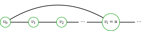 \(u = v_{i}\) なので \(\mathbf{c}\) は閉歩道であり、その長さは \(i + 1 \geq d + 1\) である。よって \(\mathbf{c}\) が閉路だと示せれば、長さが \(d + 1\) 以上の閉路を見つけたことになって証明が完了する。