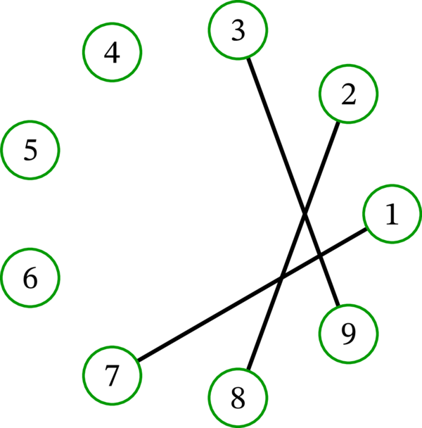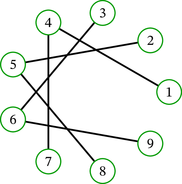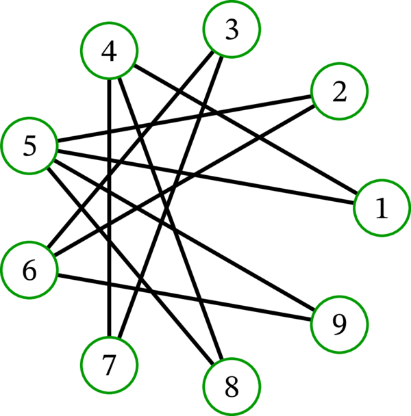 頂点集合が \(\left\{ 1,2,\ldots,9\right\} \) で、任意の二頂点 \(i\), \(j\) が \(\left\vert i-j\right\vert =6\) を満たすとき、かつそのときに限って隣接するグラフを \(G\) とする。このグラフ \(G\) の描画を示す: