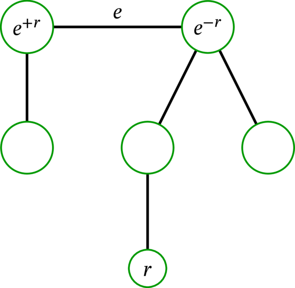 \(r\) との距離が大きい方の \(e\) の端点を \(e\) の \(r\)-子 (\(r\)-child) と呼び、\(e^{+r}\) と表記する。