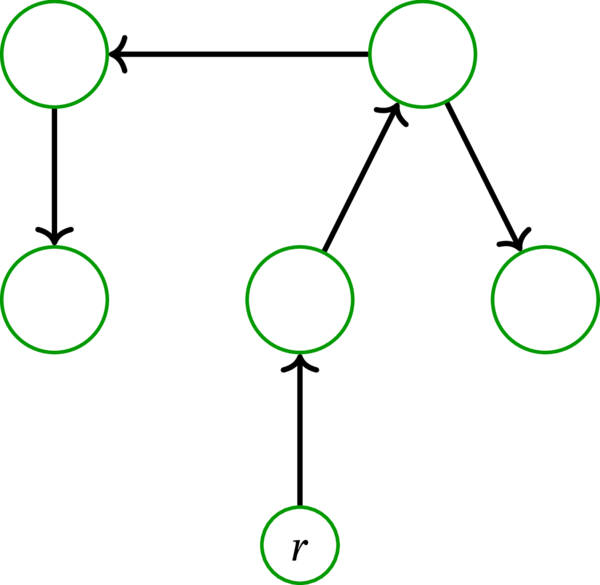 \(D\) を多重有向グラフとする。ある頂点 \(r\) が存在して \(D\) が \(r\) を根とする有向木であるとき、\(D\) を有向木 (arborescence) と呼ぶ。命題 5.7.8 より、\(D\) が有向木のとき \(D\) の根は一意に定まる。